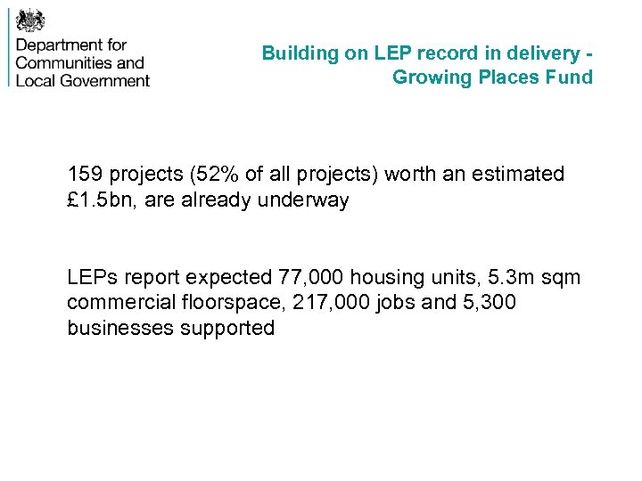 Building on LEP record in delivery Growing Places Fund 159 projects (52% of all projects) worth an estimated £ 1. 5 bn, are already underway LEPs report expected 77, 000 housing units, 5. 3 m sqm commercial floorspace, 217, 000 jobs and 5, 300 businesses supported