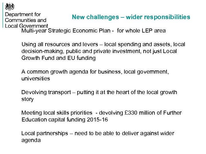 New challenges – wider responsibilities Multi-year Strategic Economic Plan - for whole LEP area Using all resources and levers – local spending and assets, local decision-making, public and private investment, not just Local Growth Fund and EU funding A common growth agenda for business, local government, universities Devolving transport – putting it at the heart of the local growth story Meeting local skills priorities - devolving £ 330 million of Further Education capital funding 2015 -16 Local partnerships – need to be able to deliver against wider agenda