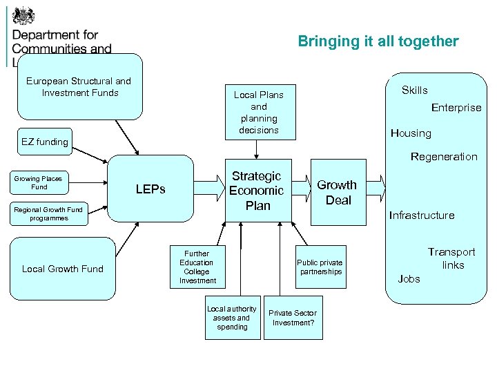 Bringing it all together European Structural and Investment Funds Skills Local Plans and planning decisions Enterprise Housing EZ funding Regeneration Growing Places Fund Strategic Economic Plan LEPs Regional Growth Fund programmes Local Growth Fund Further Education College Investment Local authority assets and spending Growth Deal GROWTH Infrastructure Public private partnerships Private Sector Investment? Transport links Jobs