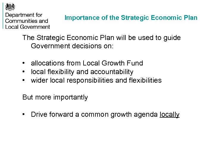 Importance of the Strategic Economic Plan The Strategic Economic Plan will be used to guide Government decisions on: • allocations from Local Growth Fund • local flexibility and accountability • wider local responsibilities and flexibilities But more importantly • Drive forward a common growth agenda locally