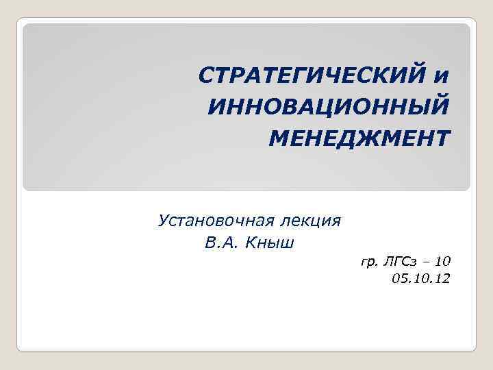 СТРАТЕГИЧЕСКИЙ и ИННОВАЦИОННЫЙ МЕНЕДЖМЕНТ Установочная лекция В. А. Кныш гр. ЛГСз – 10 05. 10. 12