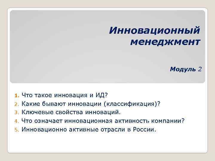 Инновационный менеджмент Модуль 2 Что такое инновация и ИД? 2. Какие бывают инновации (классификация)? 3. Ключевые свойства инноваций. 4. Что означает инновационная активность компании? 5. Инновационно активные отрасли в России. 1.