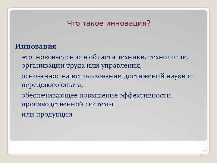 Что такое инновация? Инновация – это нововведение в области техники, технологии, организации труда или управления, основанное на использовании достижений науки и передового опыта, обеспечивающее повышение эффективности производственной системы или продукции 11 11