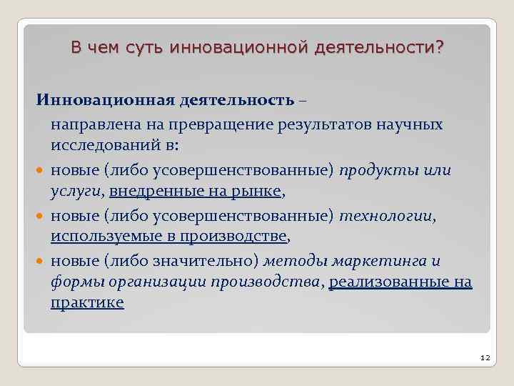 В чем суть инновационной деятельности? Инновационная деятельность – направлена на превращение результатов научных исследований в: новые (либо усовершенствованные) продукты или услуги, внедренные на рынке, новые (либо усовершенствованные) технологии, используемые в производстве, новые (либо значительно) методы маркетинга и формы организации производства, реализованные на практике 12