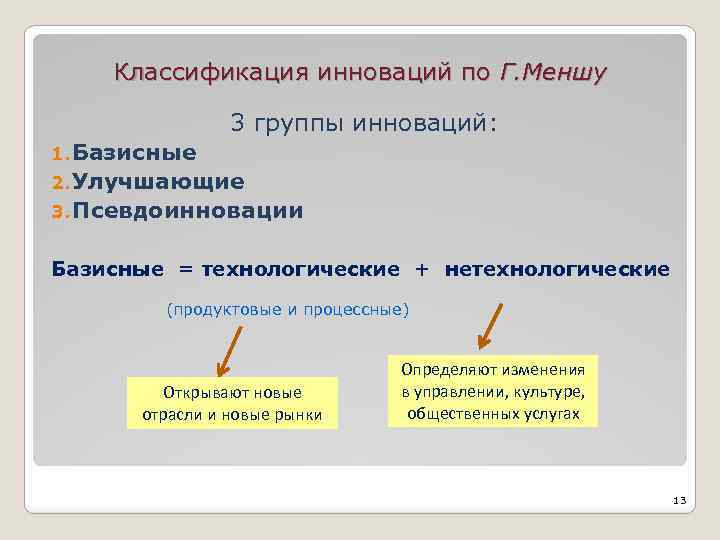 Классификация инноваций по Г. Меншу 3 группы инноваций: 1. Базисные 2. Улучшающие 3. Псевдоинновации Базисные = технологические + нетехнологические (продуктовые и процессные) Открывают новые отрасли и новые рынки Определяют изменения в управлении, культуре, общественных услугах 13