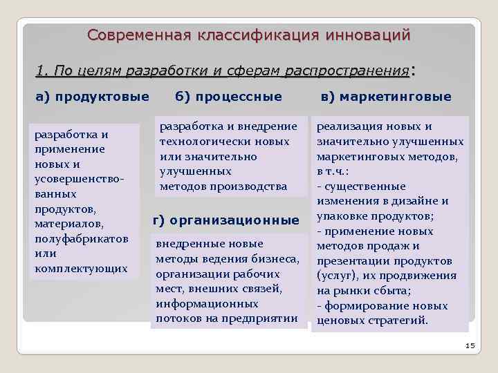 Современная классификация инноваций 1. По целям разработки и сферам распространения: а) продуктовые разработка и применение новых и усовершенствованных продуктов, материалов, полуфабрикатов или комплектующих б) процессные разработка и внедрение технологически новых или значительно улучшенных методов производства г) организационные внедренные новые методы ведения бизнеса, организации рабочих мест, внешних связей, информационных потоков на предприятии в) маркетинговые реализация новых и значительно улучшенных маркетинговых методов, в т. ч. : - существенные изменения в дизайне и упаковке продуктов; - применение новых методов продаж и презентации продуктов (услуг), их продвижения на рынки сбыта; - формирование новых ценовых стратегий. 15