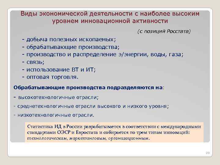 Виды экономической деятельности с наиболее высоким уровнем инновационной активности (с позиций Росстата) - добыча полезных ископаемых; - обрабатывающие производства; - производство и распределение э/энергии, воды, газа; - связь; - использование ВТ и ИТ; - оптовая торговля. Обрабатывающие производства подразделяются на: - высокотехнологичные отрасли; - среднетехнологичные отрасли высокого и низкого уровня; - низкотехнологичные отрасли. Статистика ИД в России разрабатывается в соответствии с международными стандартами ОЭСР и Евростата и собирается по трем типам инноваций: технологическим, маркетинговым, организационным. 20