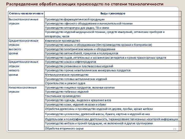 Распределение обрабатывающих производств по степени технологичности Степень технологичности Высокотехнологичные отрасли Среднетехнологичные отрасли высокого уровня Среднетехнологичные отрасли низкого уровня Низкотехнологичные отрасли Виды производств Производство фармацевтической продукции Производство офисного оборудования и вычислительной техники Производство аппаратуры для радио, ТВ и связи Производство изделий медицинской техники, средств измерений, оптических приборов и аппаратуры, часов Химическое производство Производство машин и оборудования (без производства оружия и боеприпасов) Производство электрических машин и оборудования Производство автомобилей, прицепов и полуприцепов Производство судов, летательных и космических аппаратов и прочих транспортных средств Производство кокса и нефтепродуктов Производство резиновых и пластмассовых изделий Производство прочих неметаллических минеральных продуктов Металлургическое производство Производство готовых металлических изделий Строительство и ремонт судов Производство пищевых продуктов, включая напитки Производство табачных изделий Текстильное производство Производство одежды, выделка и крашение меха Производство кожи, изделий из кожи и обуви Обработка древесины и производство изделий из дерева, пробки, кроме мебели Производство целлюлозы, древесной массы, бумаги, картона и изделий из них Издательская и полиграфическая деятельность, тиражирование записанных носителей информации Производство мебели и прочей продукции, не включенной в другие группировки Обработка вторичного сырья 21