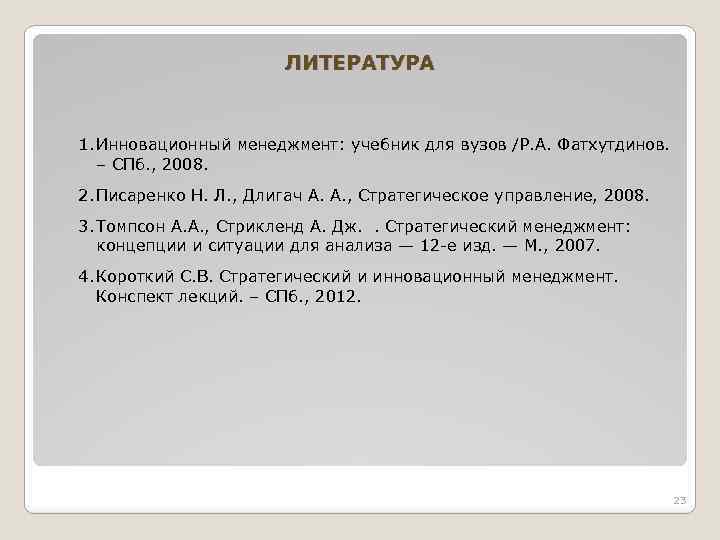 ЛИТЕРАТУРА 1. Инновационный менеджмент: учебник для вузов /Р. А. Фатхутдинов. – СПб. , 2008. 2. Писаренко Н. Л. , Длигач А. А. , Стратегическое управление, 2008. 3. Томпсон А. А. , Стрикленд А. Дж. . Стратегический менеджмент: концепции и ситуации для анализа — 12 -е изд. — М. , 2007. 4. Короткий С. В. Стратегический и инновационный менеджмент. Конспект лекций. – СПб. , 2012. 23