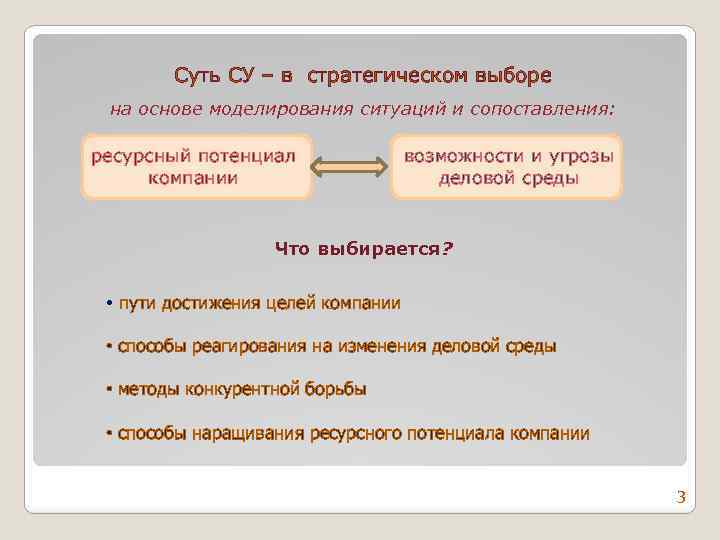 Суть СУ – в стратегическом выборе на основе моделирования ситуаций и сопоставления: ресурсный потенциал компании возможности и угрозы деловой среды Что выбирается? • пути достижения целей компании • способы реагирования на изменения деловой среды • методы конкурентной борьбы • способы наращивания ресурсного потенциала компании 3