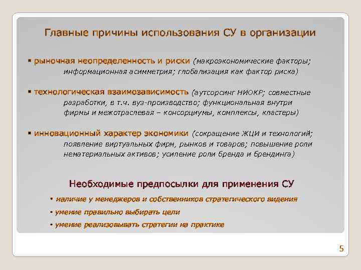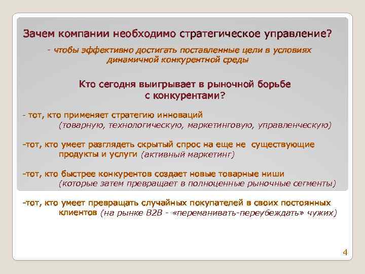 Зачем компании необходимо стратегическое управление? - чтобы эффективно достигать поставленные цели в условиях динамичной конкурентной среды Кто сегодня выигрывает в рыночной борьбе с конкурентами? - тот, кто применяет стратегию инноваций (товарную, технологическую, маркетинговую, управленческую) -тот, кто умеет разглядеть скрытый спрос на еще не существующие продукты и услуги (активный маркетинг) -тот, кто быстрее конкурентов создает новые товарные ниши (которые затем превращает в полноценные рыночные сегменты) -тот, кто умеет превращать случайных покупателей в своих постоянных клиентов (на рынке В 2 В - «переманивать-переубеждать» чужих) 4