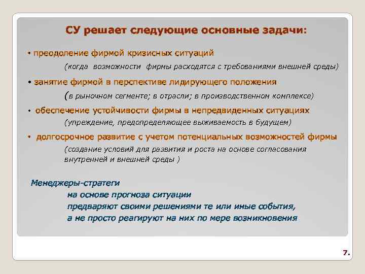 СУ решает следующие основные задачи: • преодоление фирмой кризисных ситуаций (когда возможности фирмы расходятся с требованиями внешней среды) • занятие фирмой в перспективе лидирующего положения (в рыночном сегменте; в отрасли; в производственном комплексе) • обеспечение устойчивости фирмы в непредвиденных ситуациях (упреждение, предопределяющее выживаемость в будущем) • долгосрочное развитие с учетом потенциальных возможностей фирмы (создание условий для развития и роста на основе согласования внутренней и внешней среды ) Менеджеры-стратеги на основе прогноза ситуации предваряют своими решениями те или иные события, а не просто реагируют на них по мере возникновения 7.