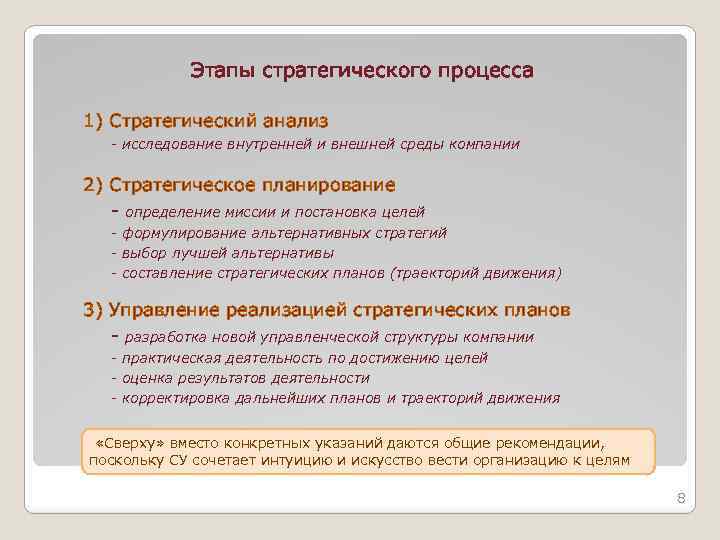 Этапы стратегического процесса 1) Стратегический анализ - исследование внутренней и внешней среды компании 2) Стратегическое планирование - определение миссии и постановка целей - формулирование альтернативных стратегий - выбор лучшей альтернативы - составление стратегических планов (траекторий движения) 3) Управление реализацией стратегических планов - разработка новой управленческой структуры компании - практическая деятельность по достижению целей - оценка результатов деятельности - корректировка дальнейших планов и траекторий движения «Сверху» вместо конкретных указаний даются общие рекомендации, поскольку СУ сочетает интуицию и искусство вести организацию к целям 8