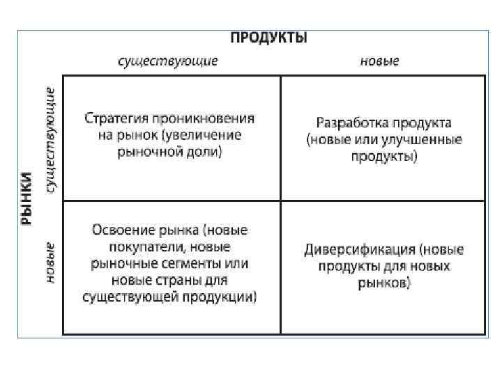 • • Матрица образует четыре поля, характеризующие положение фирмы в зависимости от сочетания двух факторов (развития и обновления рынка и продукта): фирма выступает на существующем рынке с существующим (старым) продуктом; фирма выступает на существующем рынке, но с новым продуктом; фирма выступает на новом рынке, но с существующим продуктом; фирма выступает на новом рынке с новым продуктом. Матрица позволяет выработать четыре альтернативные стратегии маркетинга.