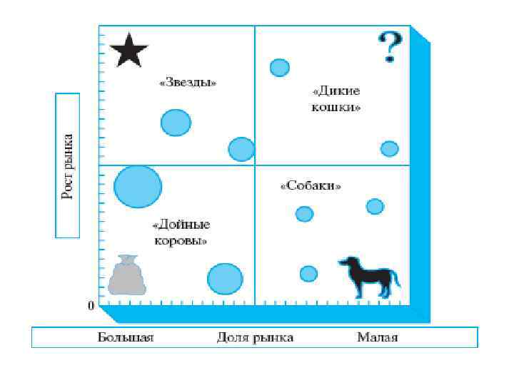 • В левом нижнем секторе находятся продукты, именуемые "дойными коровами". Они имеют большую долю на медленно развивающемся рынке. Такие продукты — основной источник доходов фирмы. • В левом верхнем секторе располагаются "звезды". Это продукты, занимающие значительную долю рынка, а спрос на них растет высокими темпами. Они требуют затрат для обеспечения дальнейшего роста и в будущем обещают стать "дойными коровами" (т. е. генераторами прибыли).