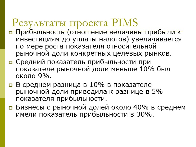 Результаты проекта PIMS Прибыльность (отношение величины прибыли к инвестициям до уплаты налогов) увеличивается по мере роста показателя относительной рыночной доли конкретных целевых рынков. Средний показатель прибыльности при показателе рыночной доли меньше 10% был около 9%. В среднем разница в 10% в показателе рыночной доли приводила к разнице в 5% показателя прибыльности. Бизнесы с рыночной долей около 40% в среднем имели показатель прибыльности в 30%.