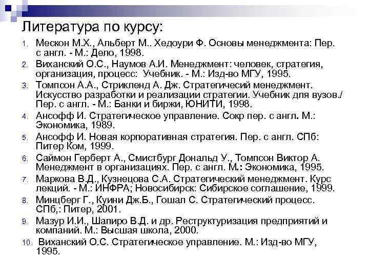 Литература по курсу: 1. Мескон М. Х. , Альберт М. . Хедоури Ф. Основы менеджмента: Пер. с англ. - М. : Дело, 1998. 2. Виханский О. С. , Наумов А. И. Менеджмент: человек, стратегия, организация, процесс: Учебник. - М. : Изд-во МГУ, 1995. 3. Томпсон А. А. , Стрикленд А. Дж. Стратегичесий менеджмент. Искусство разработки и реализации стратегии. Учебник для вузов. / Пер. с англ. - М. : Банки и биржи, ЮНИТИ, 1998. 4. Ансофф И. Стратегическое управление. Сокр пер. с англ. М. : Экономика, 1989. 5. Ансофф И. Новая корпоративная стратегия. Пер. с англ. СПб: Питep Ком, 1999. 6. Саймон Герберт А. , Смистбург Дональд У. , Томпсон Виктор А. Менеджмент в организациях. Пер. с англ. М. : Экономика, 1995. 7. Маркова В. Д. , Кузнецова С. А. Стратегический менеджмент. Курс лекций. - М. : ИНФРА; Новосибирск: Сибирское соглашение, 1999. 8. Минцберг Г. , Куини Дж. Б. , Гошал С. Стратегический процесс. СПб, : Питер, 2001. 9. Мазур И. И. , Шапиро В. Д. и др. Реструктуризация предприятий и компаний. М. : Высшая школа, 2000. 10. Виханский О. С. Стратегическое управление. М. : Изд-во МГУ, 1995.