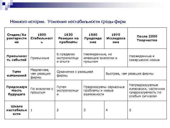 Немного истории. Усиление нестабильности среды фирм Стадии/Ха 1900 1930 1950 1970 После 2000 рактеристи Стабильност Реакция на Предвиде Исследова Творчество ки ь проблемы ние В пределах Неожиданные, но Привычнос Неожиданные и Привычные экстраполяци имеющие аналогии в ть событий совершенно новые и опыта прошлом Медленнее, Темп Сравнимая с реакцией чем реакция Быстрее, чем реакция фирмы изменений фирмы Непредсказуемые Предсказуе Путем Предсказуемы серьезные По аналогии с изменения, частичная мость экстраполяци проблемы и новые прошлым предсказуемость по будущего и возможности слабым сигналам Шкала нестабильн 1 2 3 4 5 ости