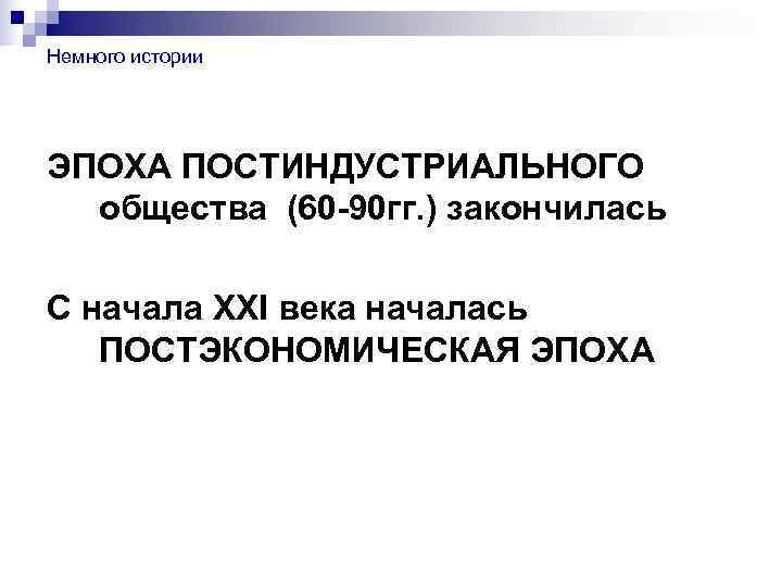 Немного истории ЭПОХА ПОСТИНДУСТРИАЛЬНОГО общества (60 -90 гг. ) закончилась С начала XXI века началась ПОСТЭКОНОМИЧЕСКАЯ ЭПОХА