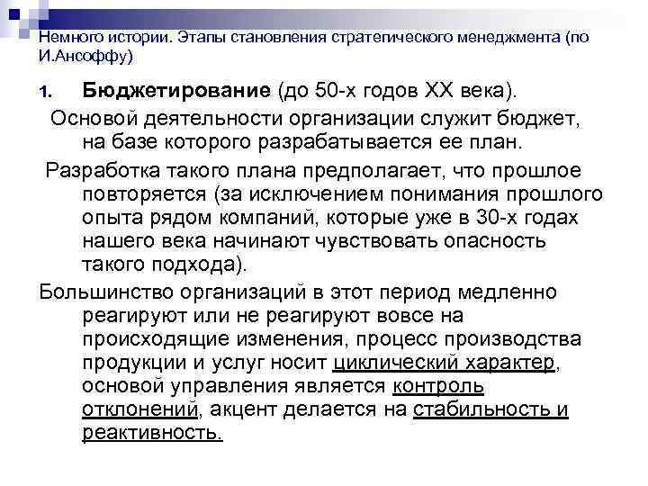 Немного истории. Этапы становления стратегического менеджмента (по И. Ансоффу) 1. Бюджетирование (до 50 -х годов XX века). Основой деятельности организации служит бюджет, на базе которого разрабатывается ее план. Разработка такого плана предполагает, что прошлое повторяется (за исключением понимания прошлого опыта рядом компаний, которые уже в 30 -х годах нашего века начинают чувствовать опасность такого подхода). Большинство организаций в этот период медленно реагируют или не реагируют вовсе на происходящие изменения, процесс производства продукции и услуг носит циклический характер, основой управления является контроль отклонений, акцент делается на стабильность и реактивность.