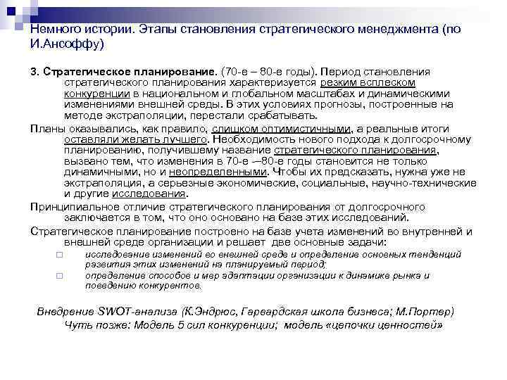 Немного истории. Этапы становления стратегического менеджмента (по И. Ансоффу) 3. Стратегическое планирование. (70 -е – 80 -е годы). Период становления стратегического планирования характеризуется резким всплеском конкуренции в национальном и глобальном масштабах и динамическими изменениями внешней среды. В этих условиях прогнозы, построенные на методе экстраполяции, перестали срабатывать. Планы оказывались, как правило, слишком оптимистичными, а реальные итоги оставляли желать лучшего. Необходимость нового подхода к долгосрочному планированию, получившему название стратегического планирования, вызвано тем, что изменения в 70 -е -– 80 -е годы становится не только динамичными, но и неопределенными. Чтобы их предсказать, нужна уже не экстраполяция, а серьезные экономические, социальные, научно-технические и другие исследования. Принципиальное отличие стратегического планирования от долгосрочного заключается в том, что оно основано на базе этих исследований. Стратегическое планирование построено на базе учета изменений во внутренней и внешней среде организации и решает две основные задачи: ¨ исследование изменений во внешней среде и определение основных тенденций развития этих изменений на планируемый период; ¨ определение способов и мер адаптации организации к динамике рынка и поведению конкурентов. Внедрение SWOT-анализа (К. Эндрюс, Гарвардская школа бизнеса; М. Портер) Чуть позже: Модель 5 сил конкуренции; модель «цепочки ценностей»
