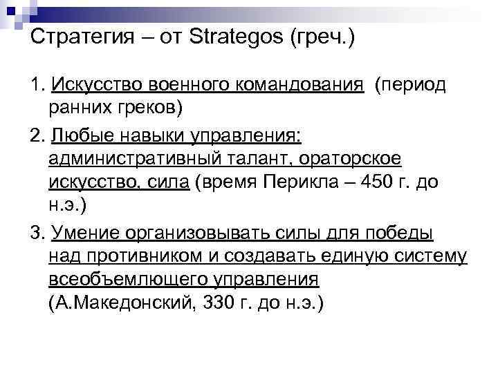 Стратегия – от Strategos (греч. ) 1. Искусство военного командования (период ранних греков) 2. Любые навыки управления: административный талант, ораторское искусство, сила (время Перикла – 450 г. до н. э. ) 3. Умение организовывать силы для победы над противником и создавать единую систему всеобъемлющего управления (А. Македонский, 330 г. до н. э. )