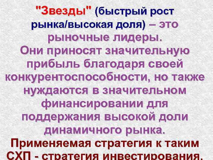 "Звезды" (быстрый рост рынка/высокая доля) – это рыночные лидеры. Они приносят значительную прибыль благодаря своей конкурентоспособности, но также нуждаются в значительном финансировании для поддержания высокой доли динамичного рынка. Применяемая стратегия к таким