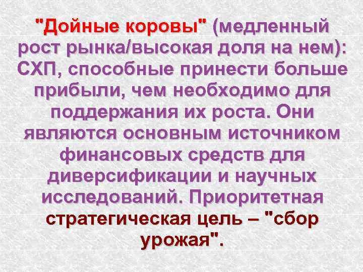 "Дойные коровы" (медленный рост рынка/высокая доля на нем): СХП, способные принести больше прибыли, чем необходимо для поддержания их роста. Они являются основным источником финансовых средств для диверсификации и научных исследований. Приоритетная стратегическая цель – "сбор урожая".