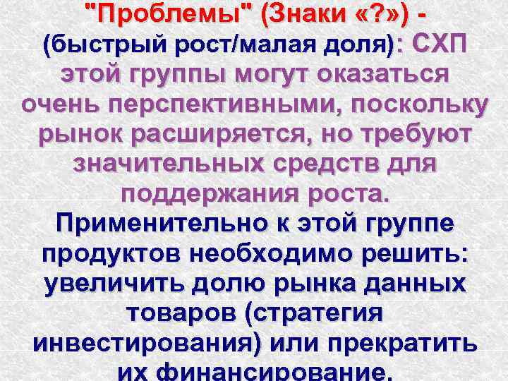"Проблемы" (Знаки «? » ) (быстрый рост/малая доля): СХП этой группы могут оказаться очень перспективными, поскольку рынок расширяется, но требуют значительных средств для поддержания роста. Применительно к этой группе продуктов необходимо решить: увеличить долю рынка данных товаров (стратегия инвестирования) или прекратить