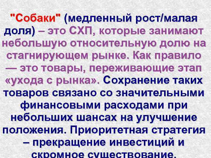 "Собаки" (медленный рост/малая доля) – это СХП, которые занимают небольшую относительную долю на стагнирующем рынке. Как правило — это товары, переживающие этап «ухода с рынка» . Сохранение таких товаров связано со значительными финансовыми расходами при небольших шансах на улучшение положения. Приоритетная стратегия – прекращение инвестиций и