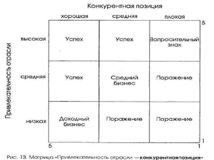 Каждая из осей матрицы условно делится на 3 части, в результате чего сетка оказывается состоящей из 9 клеток. В данной матрице выделяются 3 области стратегических позиций: область победителей; область проигравших; средняя область (позиции, в которых стабильно генерируется прибыль, средние позиции бизнеса и сомнительные виды бизнеса)