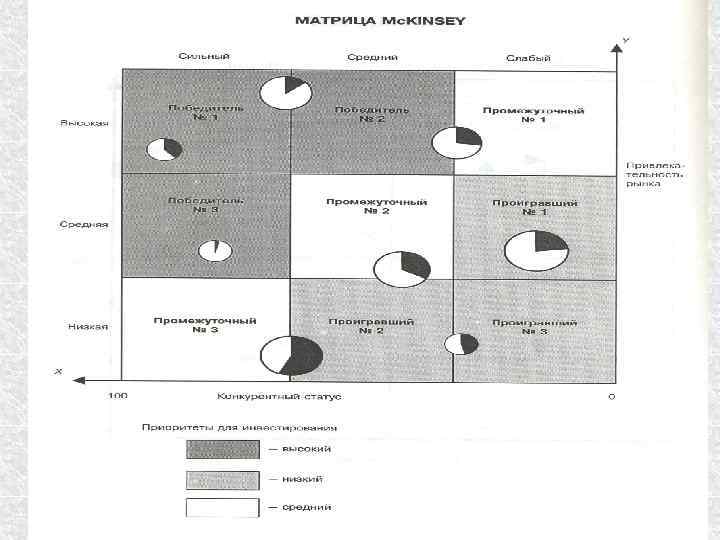 Матрица Мак. Кинзи - разработана консалтинговой компанией "Мак. Кинзи" (Mc. Kinsey) совместно с корпорацией "Дженерал Электрик" (General Electric). Она получила название "экран бизнеса". Матрица включает 9 квадрантов, а анализ в ней осуществляется по следующим параметрам: привлекательность отрасли; конкурентная позиция в отрасли.