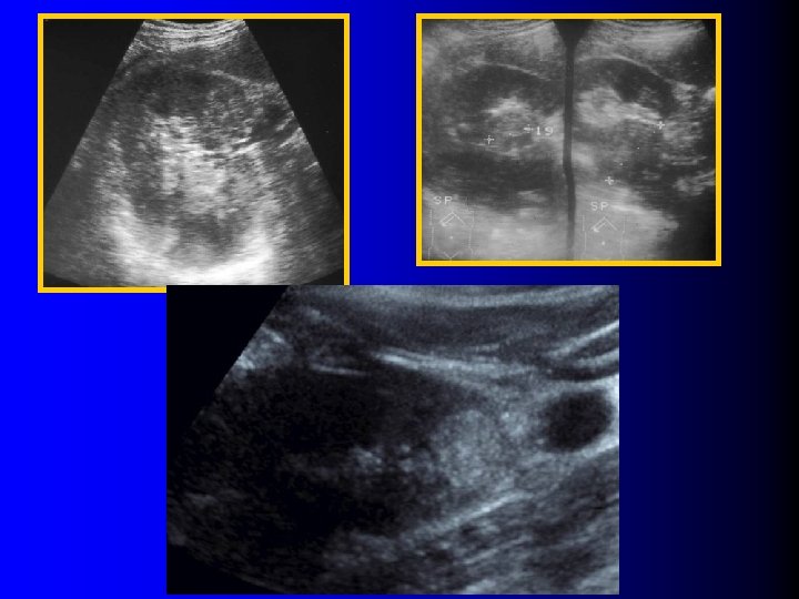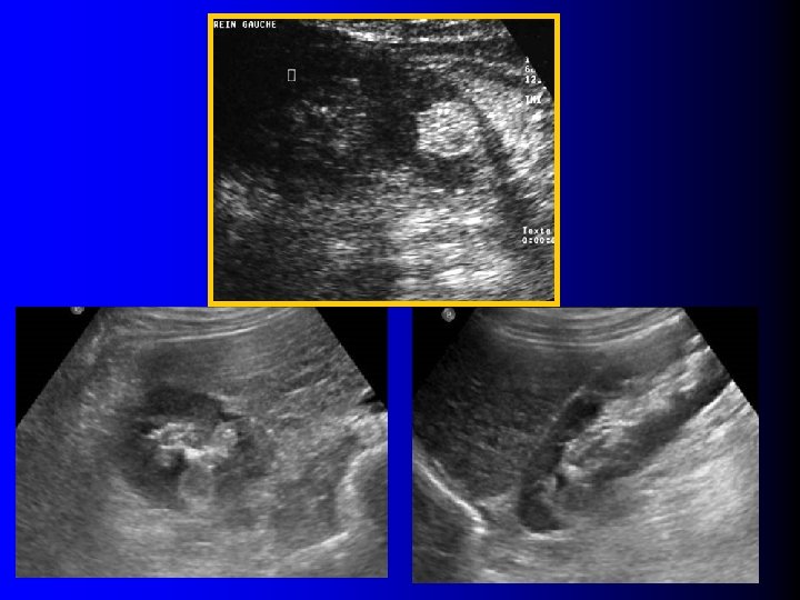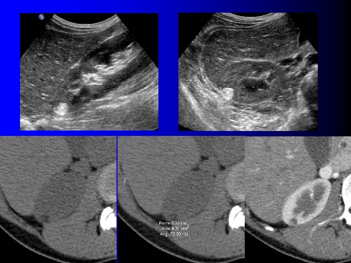 Echographie l Tumeur rénale: – Hyperéchogène (>90%) – Homogène (>90%) – Atténuante (30%)
