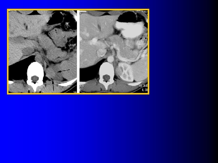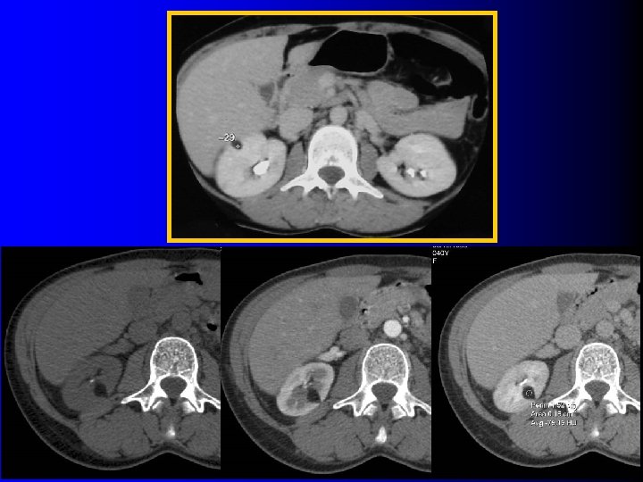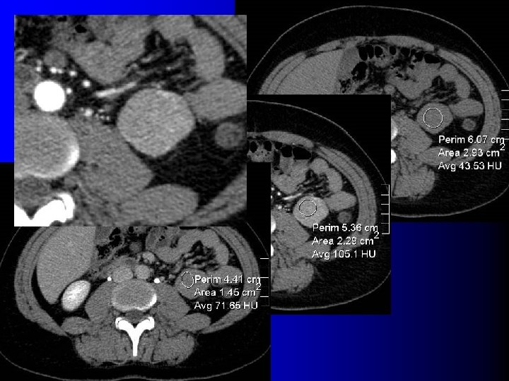 TDM: hyperdense avant injection l Quelques courtes séries(1 -2) : – 100% des AML sans graisse étaient spontanément hyperdenses l Série plus large (19 AMLs sans graisse, 62 cancers)(3) – 53% des AML sans graisse – 13 % des cancers (p = 0. 04) (1) Jinzaki M et al, Radiology 1997; 205: 497 (2) Hafron J et al, Urology 2005; 66: 1155 (3) Kim JK et al, Radiology 2004; 230: 677