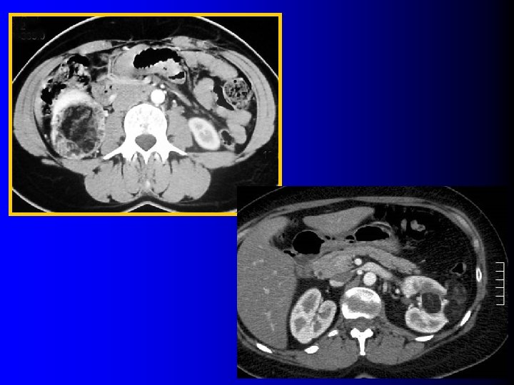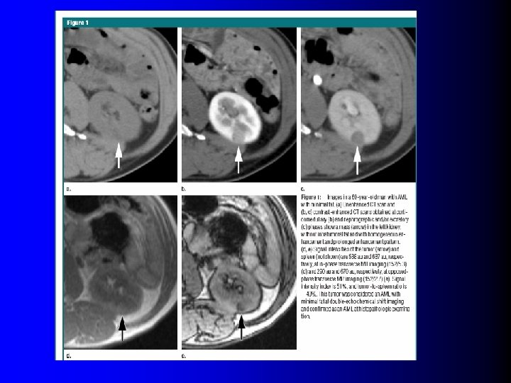 Age, sexe, taille tumorale l Age et sexe: – – l AML plus fréquent chez la femme jeune (< 40 ans) Cancer: homme, plus âgé (> 50 ans) Reste peu discriminant (1) Attention à ne pas sous-estimer le diagnostic d'AML chez l'homme ! (2) Taille tumorale: – Taille moyenne des AML sans graisse l 20 -35 mm (2 -4) – Surtout un problème de "petites" masses (1) Kim JK et al, Radiology 2006; 239: 174 (2) Berger J et al, Prog Urol (in press) (3) Kim JK et al, Radiology 2004; 230: 677 (4) Milner J et al, J Urol 2006; 176: 905 (5) Catalano OA et al, Radiology 2008; 247: 738