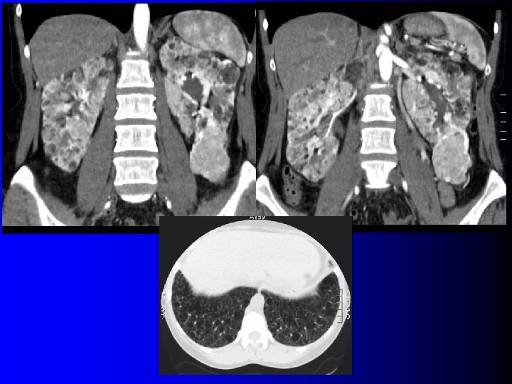 Formes cliniques l European Respiratory Society (2009) – Chez les patients avec un angiomyolipome unilatéral, sans signes cliniques de STB et sans symptômes pulmonaires une recherche de LAM par scanner thoracique peut être réalisée – Chez les patients avec des angiomyolipomes bilatéraux, une recherche de STB et de LAM doit être pratiquée