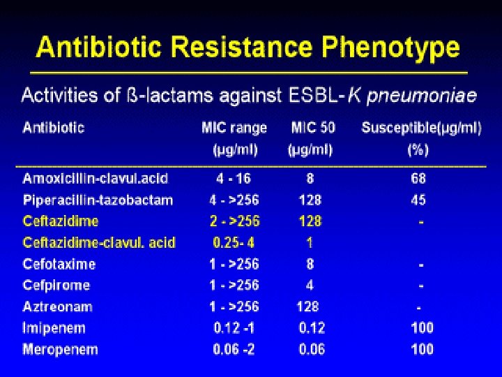 Extended Spectrum lactamases ESBLs ► ESBL inactivates oxyamino beta-lactams and fourth-generation cephalosporins (to some extent) and aztreonam ► Large plasmids encoding multiple antibiotic resistance determinants including aminoglycoside modifying enzymes ► Strains producing ESBL are typically sensitive to cephamycins and carbapenems ► Common ESBL-producers: K. pneumoniae, and less common other Enterobactericae