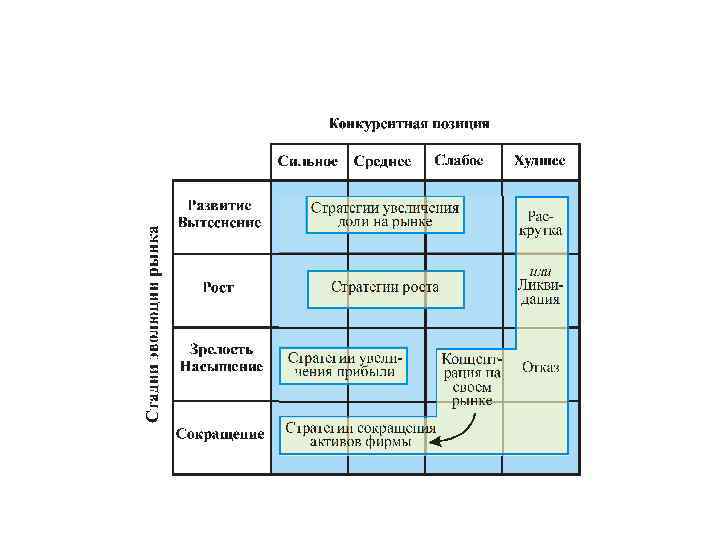 Матрица конкурентных преимуществ Позиция на рынке Упреждающие стратегии Пассивные стратегии Лидеры рынка Захват рынка Перехват Защита рынка Блокировка рынка Атака в лоб Следование Прорыв по курсу Окружение Сосредоточение сил на участке Сохранение позиций Претендент на лидера Избегающие прямой конкуренции Обход