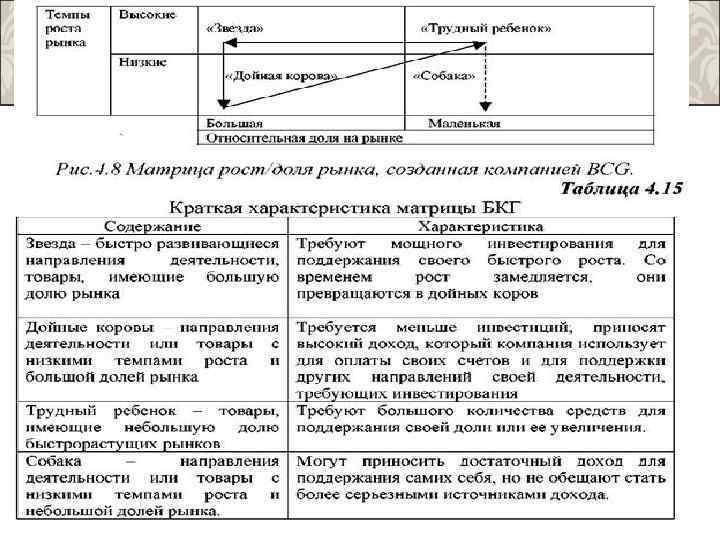 МОДЕЛЬ ДОЛЯ РЫНКА – РОСТ РЫНКА (ПОРТФОЛИО-АНАЛИЗ, МАТРИЦА БОСТОН КОНСАЛТИНГ ГРУПП (БКГ)) Модель основывается на концепции жизненного цикла продукта и на концепции кривой опыта, обосновывает продуктовый портфель крупной фирмы. Различные товары имеют разные рыночные шансы и риск. Портфолио анализ является на сегодняшний день одним из наиболее часто применяемых инструментов стратегического маркетинга. Теоретическая база моделей портфельного анализа: 1) Кривая опыта. С ростом объема производства и опыта снижаются затраты ресурсов на единицу продукции. 2) Концепция жизненного цикла товара. Концепция Портфолио исходит из того, что создание успешной марки всегда связано с большими инвестициями и связывает много ресурсов. Если марка удачна, то сбыт продукта выходит на высокий уровень и держится без особо больших расходов. В этот период товар приносит значительные доходы и высвобождает финансовые ресурсы. 3) ПИМС проект – эмпирическое исследование факторов, влияющих на рентабельность предприятий и реакции рентабельности на изменение рыночной ситуации.