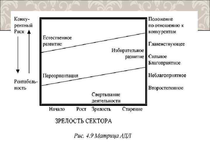 МАТРИЦА АДЛ Оригинальным подходом к проблеме динамического анализа отличается матрица, предложенная Артуром Д. Литлом. Она имеет более сложную схему. А. Литл ввел в нее другие, чем в матрице БКГ, переменные: зрелость сектора и положение по отношению к конкурентам. Зрелость сектора отражает этапы изменения рынка, соответствующие стадиям ЖЦТ. Тем самым обеспечивается возможность анализа развития рынка во времени. Каждому этапу соответствуют определенные финансовые характеристики, специфические формы конкуренции, различные формы стратегического поведения. При определении положения в отношении конкурентов используются и показатели рыночной доли, и показатели конкурентоспособности, и интенсивность конкурентной борьбы.