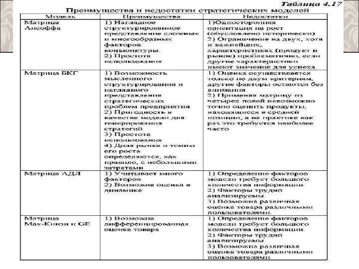 Разработка маркетинговой стратегии – сложный процесс, одним из методов формализации которого является моделирование, позволяющее выбрать оптимальный вариант стратегического решения, избежать распыления сил и средств. Маркетинговая стратегическая матрица это модель выбора фирмой определенной стратегии в зависимости от конкретной рыночной конъюнктуры и собственных возможностей или других факторов.