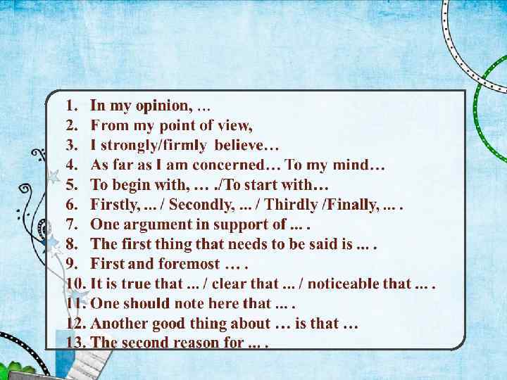 1. Experts. . . 2. . believe that …. 3. . say that …. 4. . suggest that …. . 5. . are convinced that …. 6. . point out that …. 7. . emphasize that …. 8. According to some experts. . . 9. Perhaps we should also point out the fact that. . 10. It would be unfair not to mention that fact that. . 11. One must admit that. . 12. We cannot ignore the fact that. . 13. One cannot possibly accept the fact that. . 14. From these facts, one may conclude that. . 15. Which seems to confirm the idea that. . 16. Thus, . . . / Therefore, . . . 17. The most common argument against this is that. .