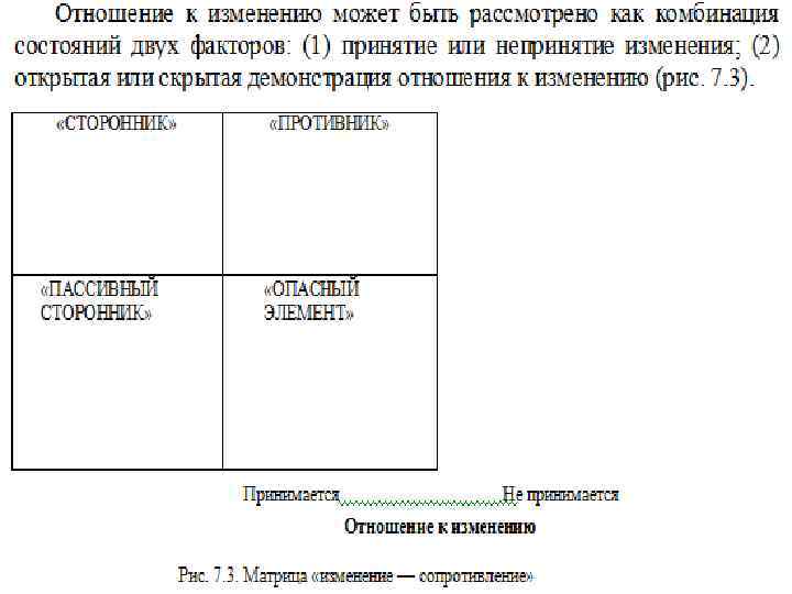 Проблемы проведения стратегических изменений Проведение стратегических изменений в организации является очень сложной задачей. Трудности решения этой задачи в первую очередь связаны с тем, что всякое изменение встречает сопротивление, которое иногда может быть столь сильным, что его не удается преодолеть тем, кто проводит изменения. Поэтому, для того чтобы провести изменения, необходимо, как минимум, проделать следующее: § вскрыть, проанализировать и предсказать то, какое сопротивление может встретить планируемое изменение; § уменьшить до возможного минимума это сопротивление (потенциальное и реальное); § установить статус кво нового состояния.