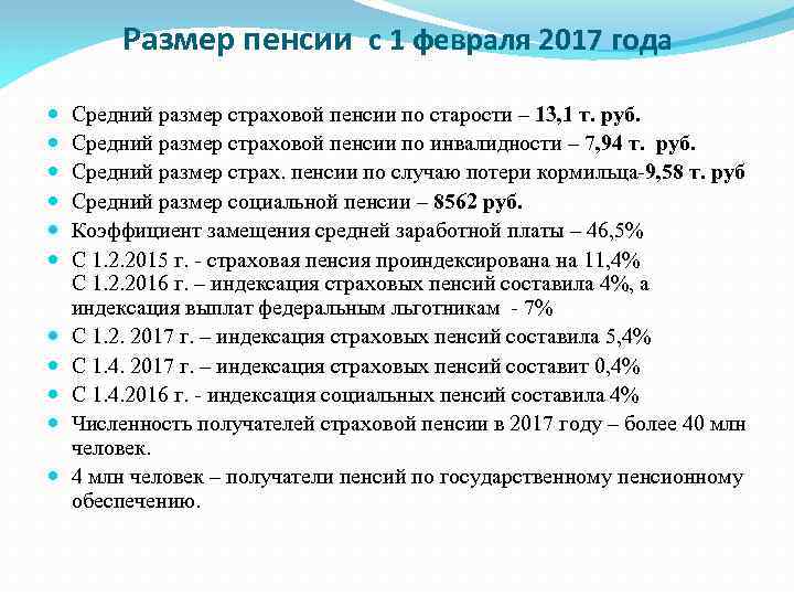Размер пенсии с 1 февраля 2017 года Средний размер страховой пенсии по старости – 13, 1 т. руб. Средний размер страховой пенсии по инвалидности – 7, 94 т. руб. Средний размер страх. пенсии по случаю потери кормильца-9, 58 т. руб Средний размер социальной пенсии – 8562 руб. Коэффициент замещения средней заработной платы – 46, 5% С 1. 2. 2015 г. - страховая пенсия проиндексирована на 11, 4% С 1. 2. 2016 г. – индексация страховых пенсий составила 4%, а индексация выплат федеральным льготникам - 7% С 1. 2. 2017 г. – индексация страховых пенсий составила 5, 4% С 1. 4. 2017 г. – индексация страховых пенсий составит 0, 4% С 1. 4. 2016 г. - индексация социальных пенсий составила 4% Численность получателей страховой пенсии в 2017 году – более 40 млн человек. 4 млн человек – получатели пенсий по государственному пенсионному обеспечению.