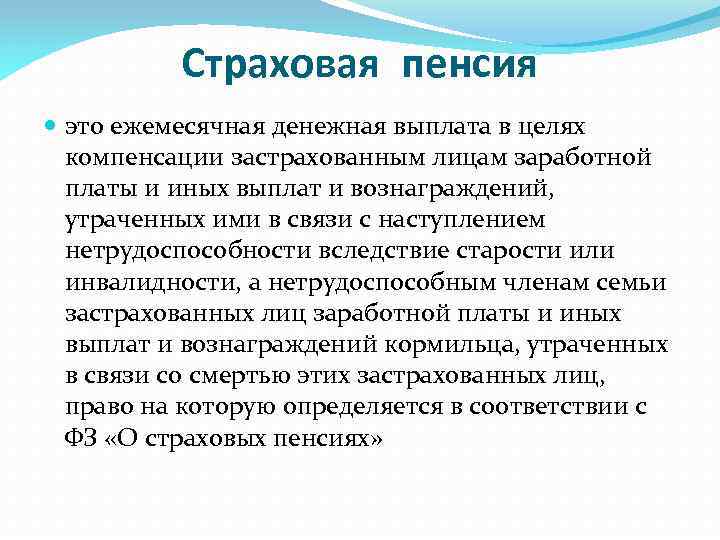 Страховая пенсия это ежемесячная денежная выплата в целях компенсации застрахованным лицам заработной платы и иных выплат и вознаграждений, утраченных ими в связи с наступлением нетрудоспособности вследствие старости или инвалидности, а нетрудоспособным членам семьи застрахованных лиц заработной платы и иных выплат и вознаграждений кормильца, утраченных в связи со смертью этих застрахованных лиц, право на которую определяется в соответствии с ФЗ «О страховых пенсиях»