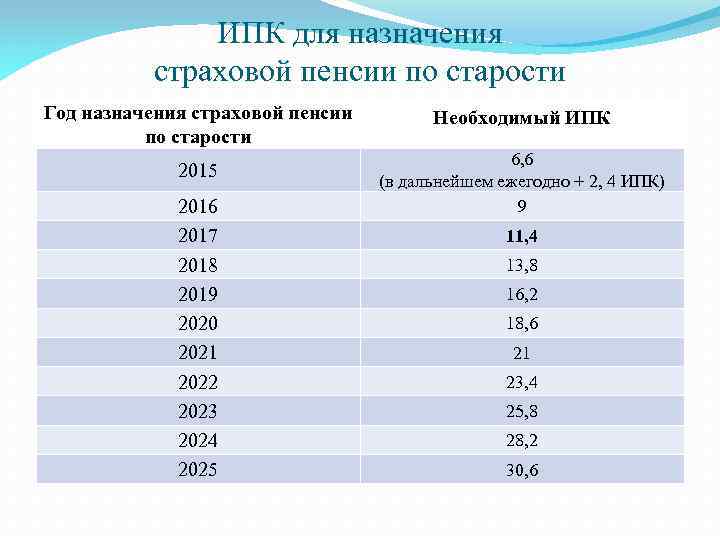 ИПК для назначения страховой пенсии по старости Год назначения страховой пенсии по старости 2015 2016 2017 2018 2019 2020 2021 2022 2023 2024 2025 Необходимый ИПК 6, 6 (в дальнейшем ежегодно + 2, 4 ИПК) 9 11, 4 13, 8 16, 2 18, 6 21 23, 4 25, 8 28, 2 30, 6