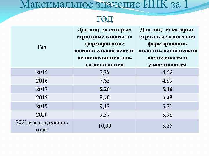 Максимальное значение ИПК за 1 год Год 2015 2016 2017 2018 2019 2020 2021 и последующие годы Для лиц, за которых страховые взносы на формирование накопительной пенсии не начисляются и уплачиваются 7, 39 4, 62 7, 83 4, 89 8, 26 5, 16 8, 70 5, 43 9, 13 5, 71 9, 57 5, 98 10, 00 6, 25