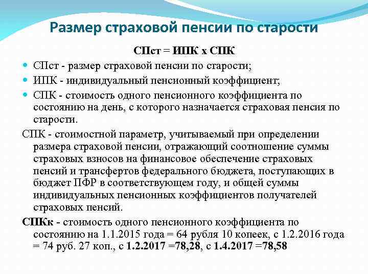 Размер страховой пенсии по старости СПст = ИПК х СПК СПст - размер страховой пенсии по старости; ИПК - индивидуальный пенсионный коэффициент; СПК - стоимость одного пенсионного коэффициента по состоянию на день, с которого назначается страховая пенсия по старости. СПК - стоимостной параметр, учитываемый при определении размера страховой пенсии, отражающий соотношение суммы страховых взносов на финансовое обеспечение страховых пенсий и трансфертов федерального бюджета, поступающих в бюджет ПФР в соответствующем году, и общей суммы индивидуальных пенсионных коэффициентов получателей страховых пенсий. СПКк - стоимость одного пенсионного коэффициента по состоянию на 1. 1. 2015 года = 64 рубля 10 копеек, с 1. 2. 2016 года = 74 руб. 27 коп. , с 1. 2. 2017 =78, 28, с 1. 4. 2017 =78, 58
