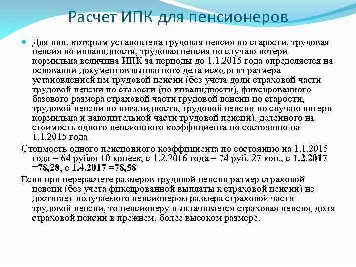Расчет ИПК для пенсионеров Для лиц, которым установлена трудовая пенсия по старости, трудовая пенсия по инвалидности, трудовая пенсия по случаю потери кормильца величина ИПК за периоды до 1. 1. 2015 года определяется на основании документов выплатного дела исходя из размера установленной им трудовой пенсии (без учета доли страховой части трудовой пенсии по старости (по инвалидности), фиксированного базового размера страховой части трудовой пенсии по старости, трудовой пенсии по инвалидности, трудовой пенсии по случаю потери кормильца и накопительной части трудовой пенсии), деленного на стоимость одного пенсионного коэффициента по состоянию на 1. 1. 2015 года. Стоимость одного пенсионного коэффициента по состоянию на 1. 1. 2015 года = 64 рубля 10 копеек, с 1. 2. 2016 года = 74 руб. 27 коп. , с 1. 2. 2017 =78, 28, с 1. 4. 2017 =78, 58 Если при перерасчете размеров трудовой пенсии размер страховой пенсии (без учета фиксированной выплаты к страховой пенсии) не достигает получаемого пенсионером размера страховой части трудовой пенсии, то пенсионеру выплачивается страховая пенсия, доля страховой пенсии в прежнем, более высоком размере.