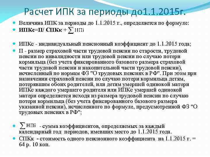 Расчет ИПК за периоды до 1. 1. 2015 г. Величина ИПК за периоды до 1. 1. 2015 г. , определяется по формуле: ИПКс=П/ СПКк + ИПКс - индивидуальный пенсионный коэффициент до 1. 1. 2015 года; П - размер страховой части трудовой пенсии по старости, трудовой пенсии по инвалидности или трудовой пенсии по случаю потери кормильца (без учета фиксированного базового размера страховой части трудовой пенсии и накопительной части трудовой пенсии), исчисленный по нормам ФЗ "О трудовых пенсиях в РФ". При этом при назначении страховой пенсии по случаю потери кормильца детям, потерявшим обоих родителей, или детям умершей одинокой матери ИПКс каждого умершего родителя или ИПКс умершей одинокой матери определяется исходя из размера трудовой пенсии по случаю потери кормильца (без учета фиксированного базового размера указанной пенсии), исчисленного по формуле, предусмотренной ФЗ "О трудовых пенсиях в РФ"; - сумма коэффициентов, определяемых за каждый календарный год периодов, имевших место до 1. 1. 2015 года. СПКк - стоимость одного пенсионного коэффициента на 1. 1. 2015 г. = 64 р. 10 коп.